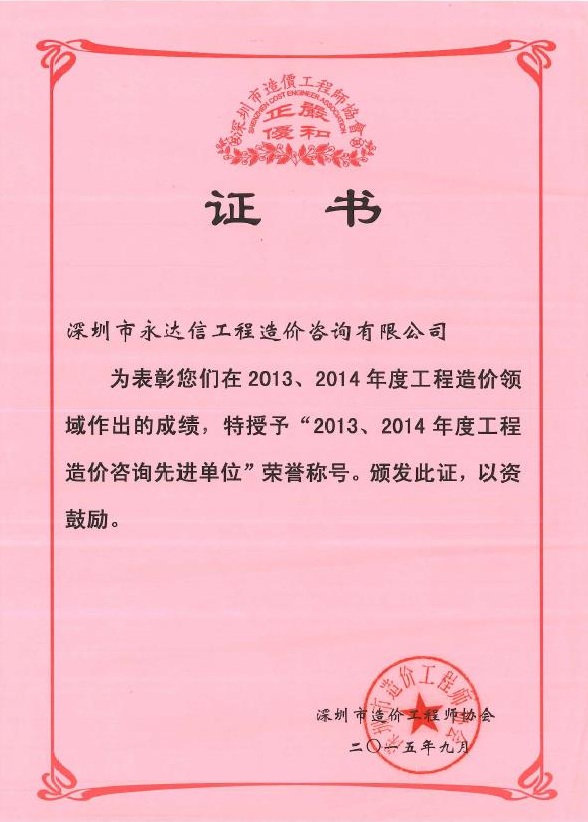 深圳市造价工程师协会2013-2014年度先进单位