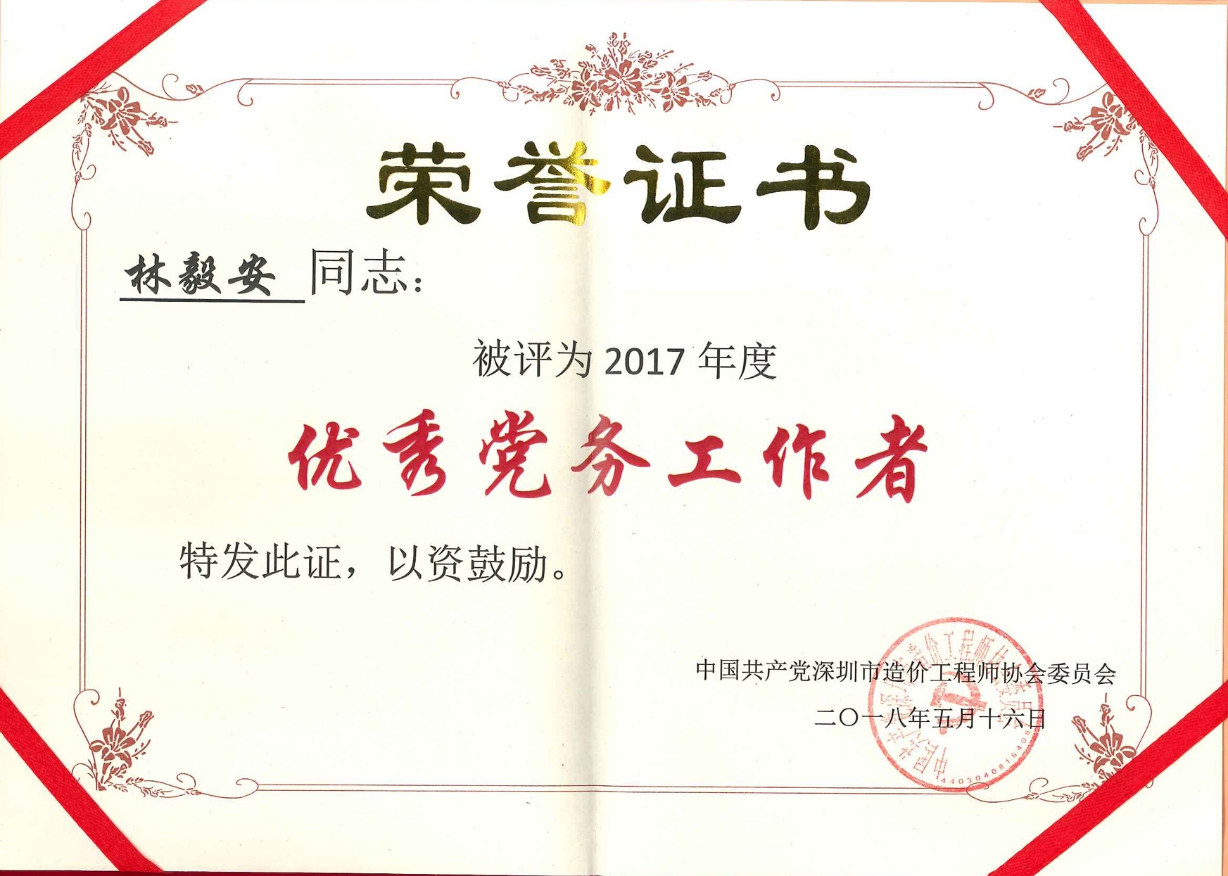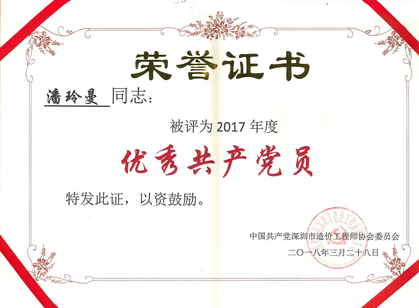 在中国共产党深圳市造价师工程师协会委员会关于2017年度先进评比中,我司荣获先进党支部称号,公司董事长潘玲曼女士荣获优秀共产党员,公司员工林毅安同志荣获优秀党务工作者称号。