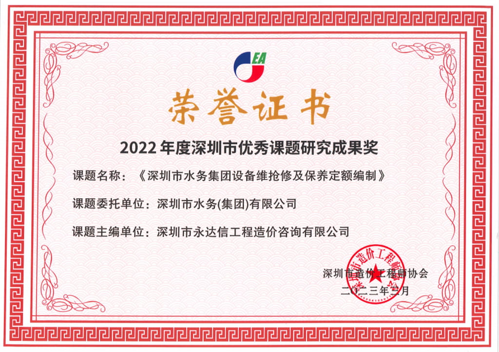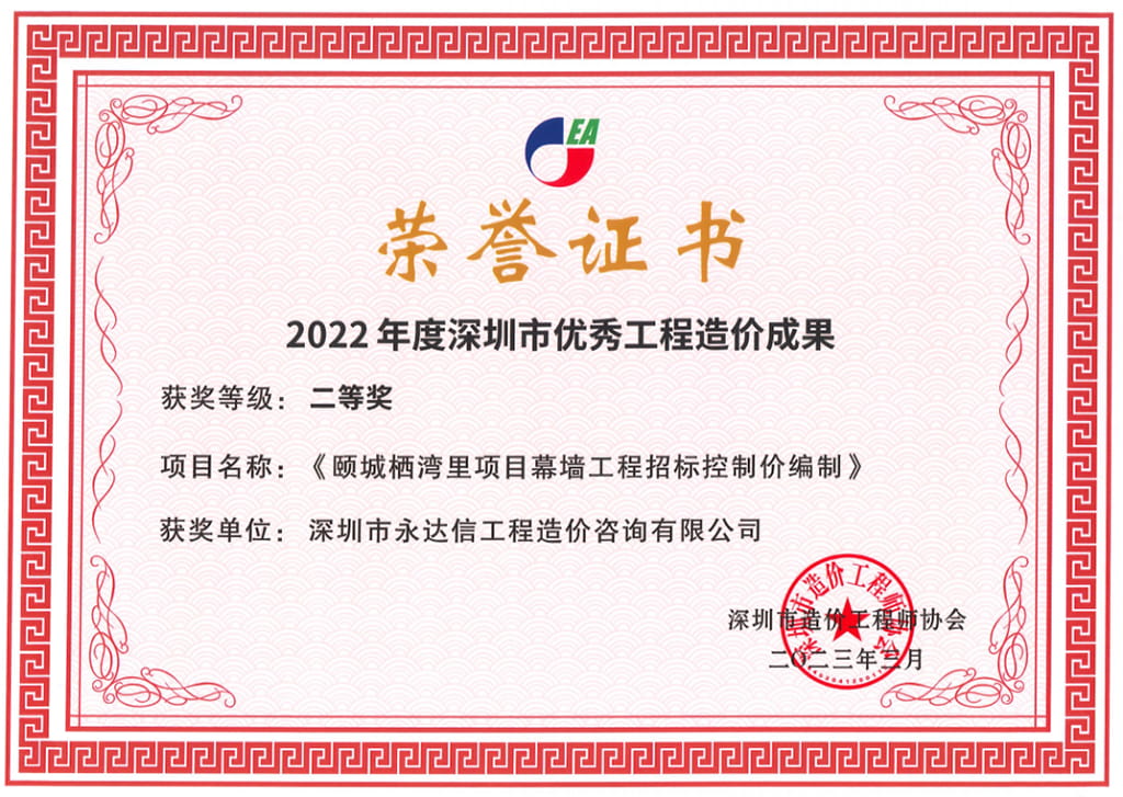 近日,在深圳市造价工程师协会开展的深圳市造价咨询行业2022年度先进单位、优秀工程造价成果和优秀个人评选活动中,永达信凭借在工程造价领域的优秀业绩和突出贡献,荣获“2022年度工程造价咨询先进单位”等荣誉称号。